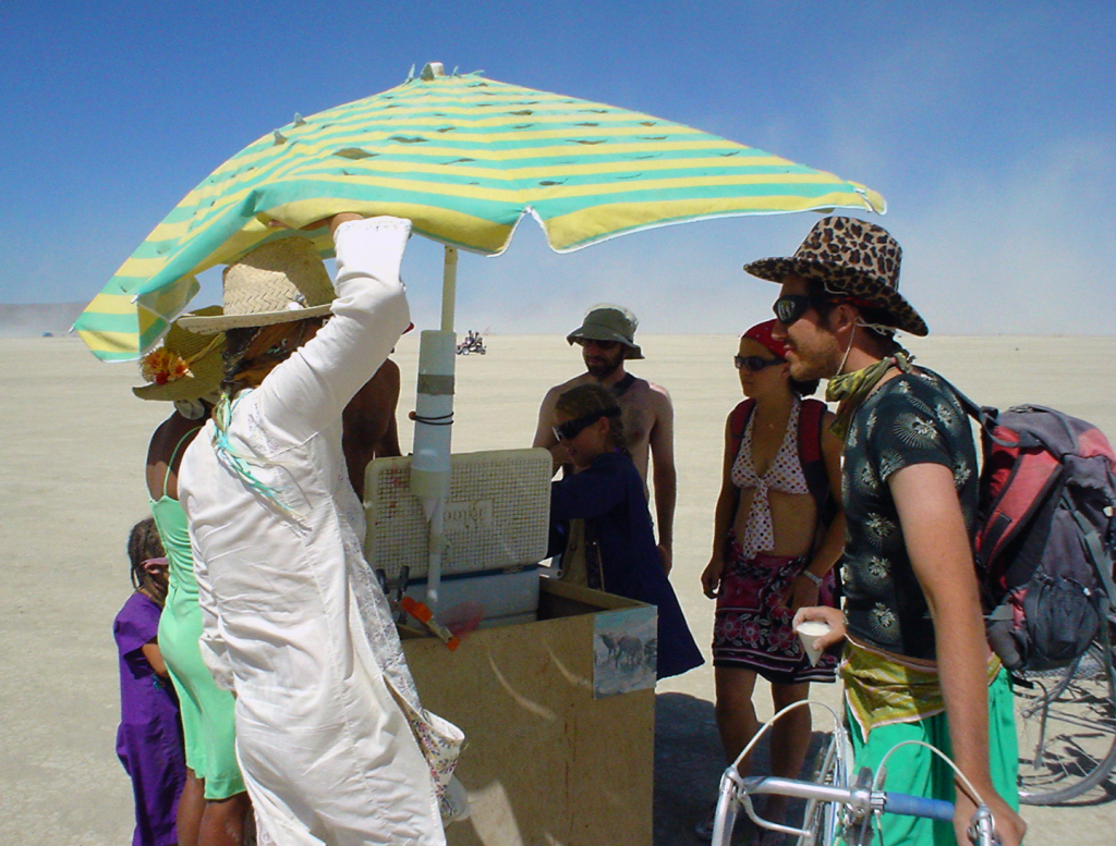 I LOVE bicycles and one of my favorite things about BRC is how cycle centric it is. So when I am there, I ride along every street, and criss cross the open playa to visit every art installation. On one trip across the deep playa, I stopping to view a fairly small but personal work of art, a plywood sculpture papered with family snapshots. I dropped my bike and studied the photos, enjoying the images of a happy family shown there, with a mom a dad and two little girls growing up together. From about 50 feet away, I heard a little voice call from beneath a beach umbrella mounted on a homemade bike trailer, “Excuse me” she shouted, “Wanna snowcone?”