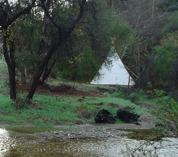 Then when my mom died in 1986, my older sister and I each got a large life insurance benefit thanks to the foresight of her significant other/business manager who had managed to put her business affairs in order. They had been a disaster in the years before her death, willfully mismanaged by my younger sister in thrall of an unscrupulous con man. Flush with cash, we started looking for a house to buy in Topanga, but again found nothing we could afford, so my sister and I pooled our benefits and bought some vacant land, 8 beautiful acres at the end of a dusty dirt road including a lovely little valley with a seasonal creek and the state park as our neighbor. My wife bought a trailer from another coop family that they had lived in while building their home, and in an act of great faith, she moved us all onto the land were she began assembling a little compound adding a tipi, then more tents, more trailers, and gravel paths she lined with river rocks. She had, with stunning and admirable courage and wisdom dragged me into a situation where despite my general cowardice, I had little choice but to step up, mimic her bravery and build her a house.